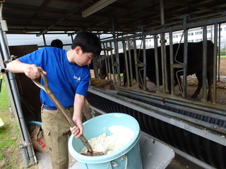 5月1日(木)放課後,畜産部生は小雨の中,給餌,ほ乳,除ふんなどの管理作業を行っていました。